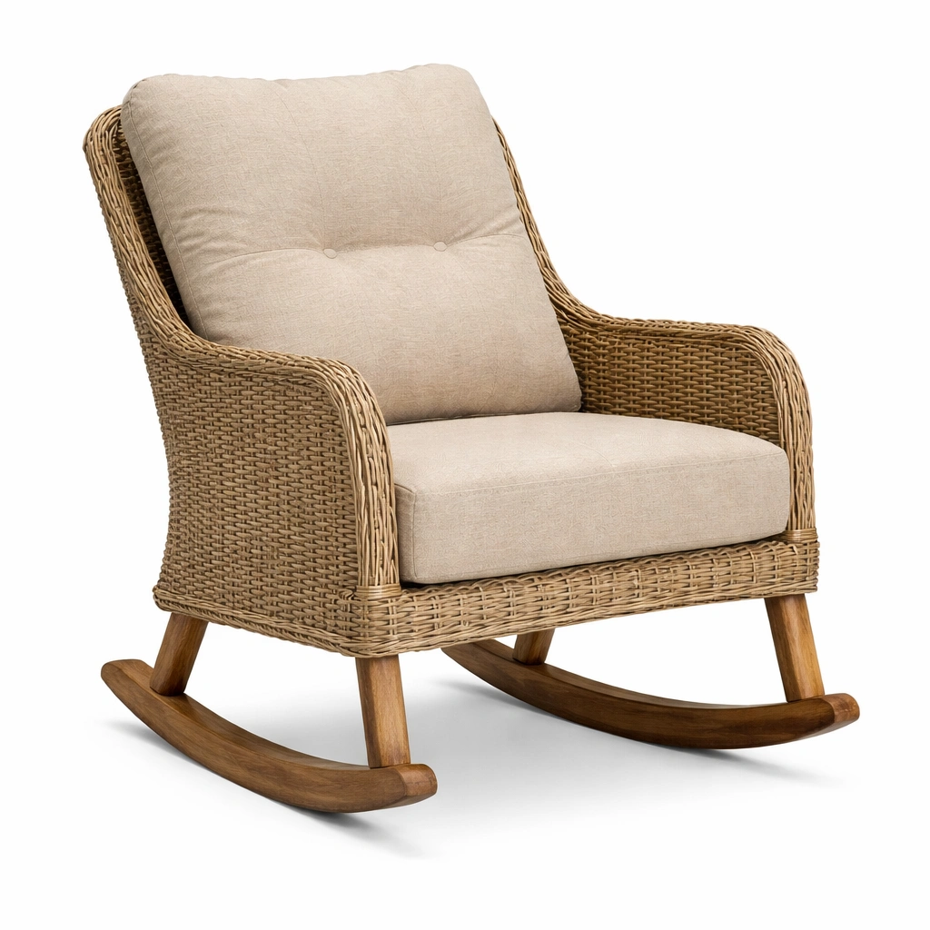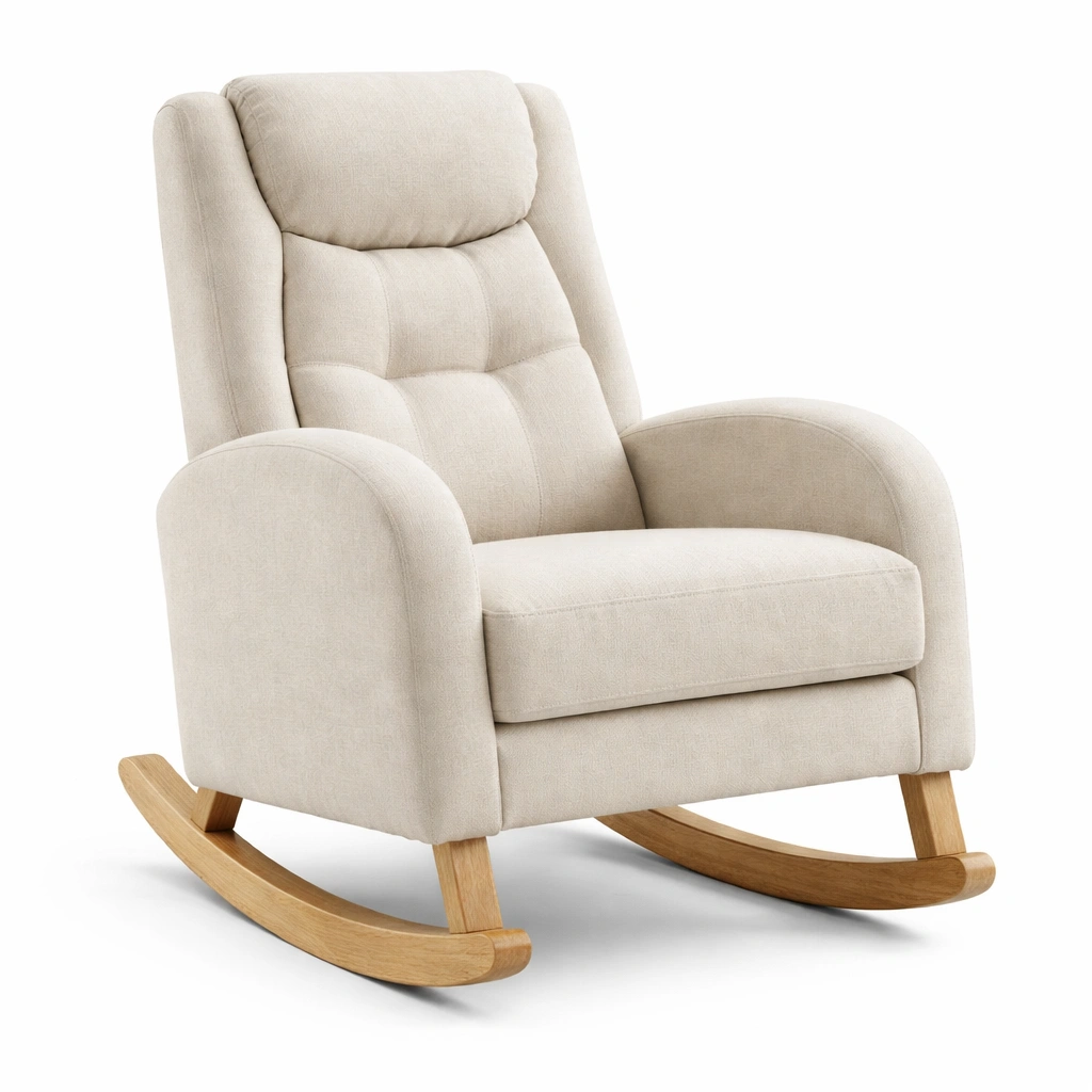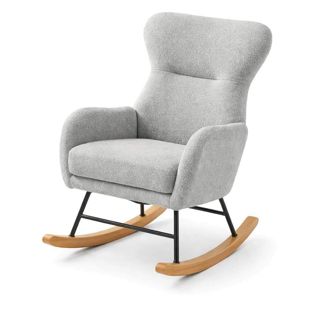 Silla mecedora de poliéster gris con base de madera y estructura de metal